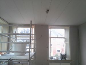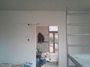 Stucen van plafond en plafondplinten en de wanden in de keuken.